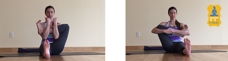 Let’s start with the fork lift version – or baby hold even. This will be just like the supine version, but seated. Goal here is to keep your spine as long and tall as possible – most of us start to round in this position as we get into the hip opening.