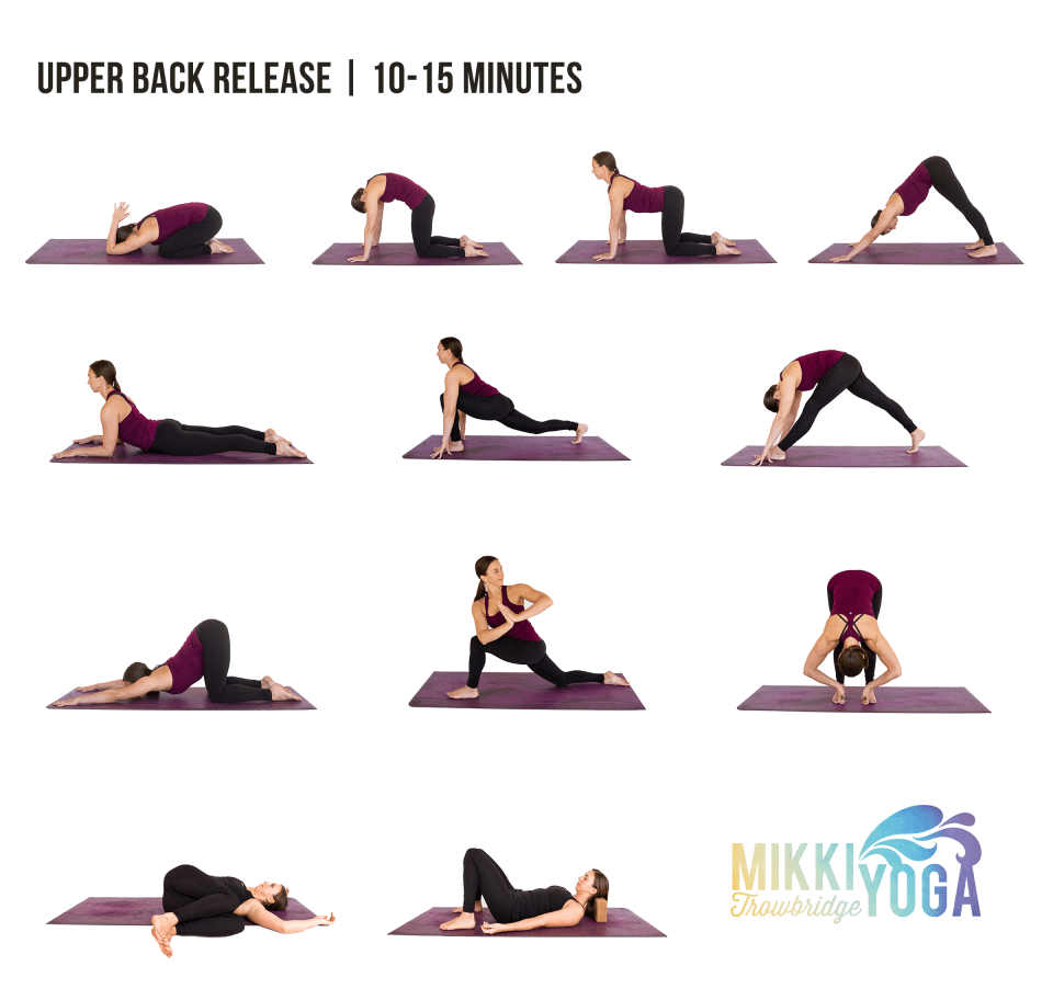On my list of top requests for class is upper back release. Between our desks, our cell phones, our steering wheel, and how much we just tend to live in our brains … the upper back gets very neglected and very tight. Here is a mini sequence to help get the upper back moving and to release some of the typical tight spots. Pick one or two poses from this sequence, or do them all. Either way, your upper back will thank you.